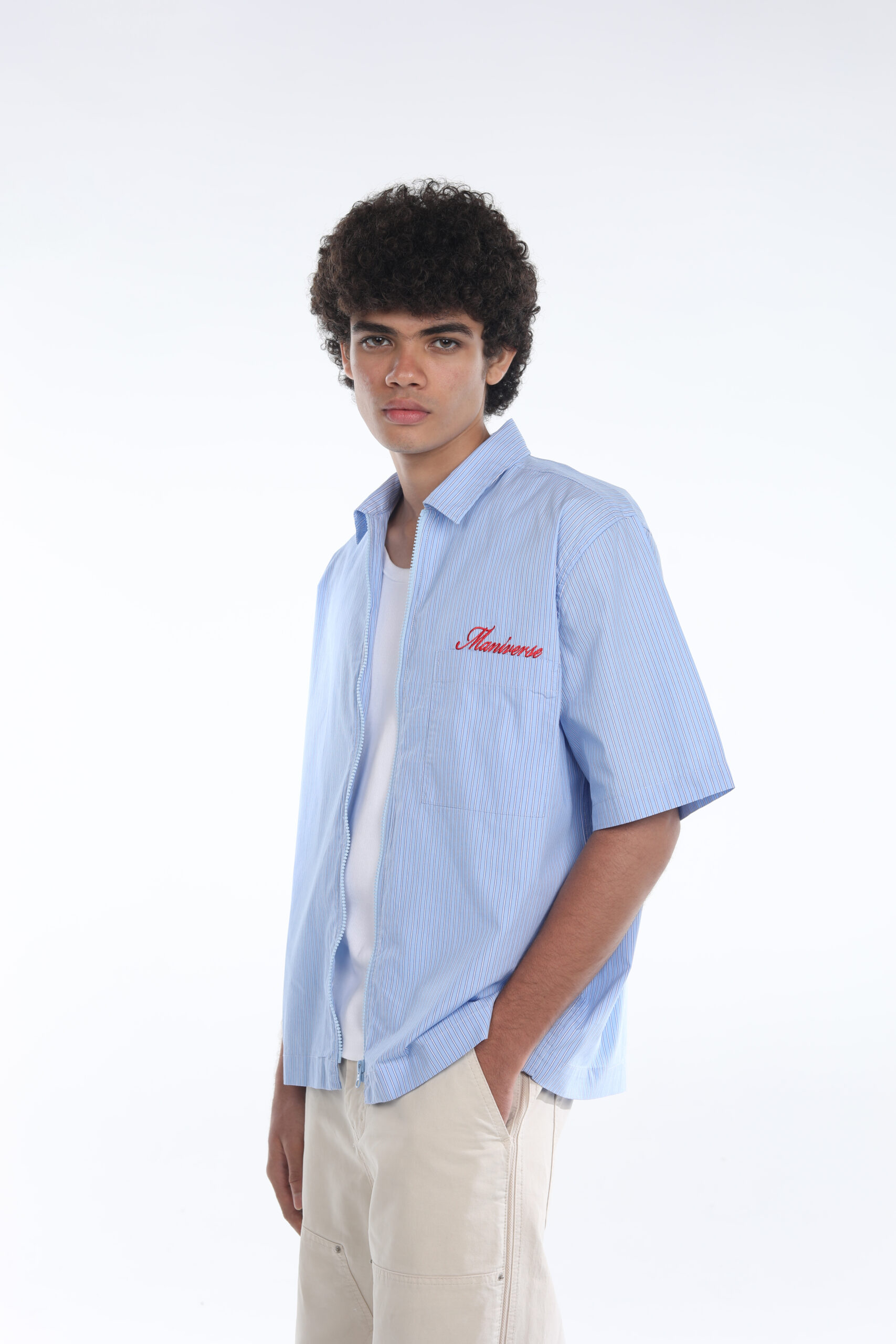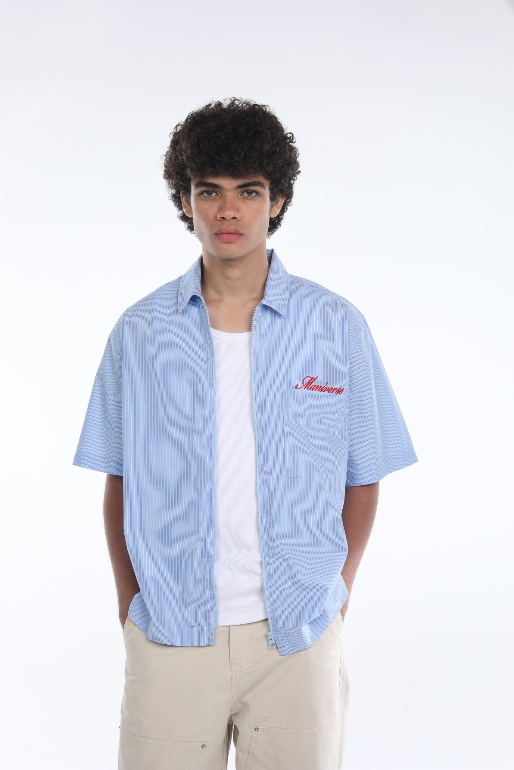 The MANIVERSE Embroidered Boxy Fit Zip Closure Striped Dark Blue Shirt will enhance your streetwear edge. This shirt, which has a loose boxy style and a dramatic front zip closure, combines clean, contemporary design with vintage appeal. An easygoing staple gains sophisticated refinement from the red-and-white fine stripes and distinctive MANIVERSE embroidery.